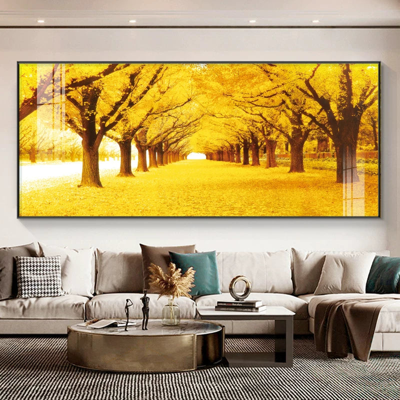 这幅「黄金大道」挂画,以满幅金黄树叶与林荫大道为核心意象,在风水寓意上极具招财旺运的吉兆: